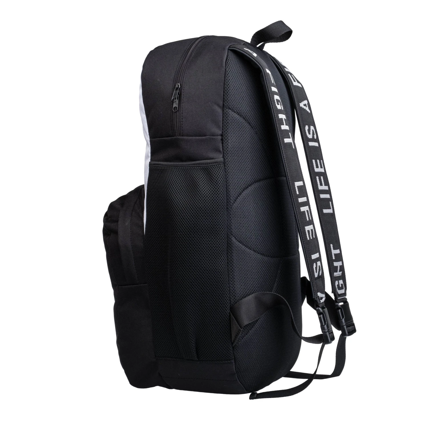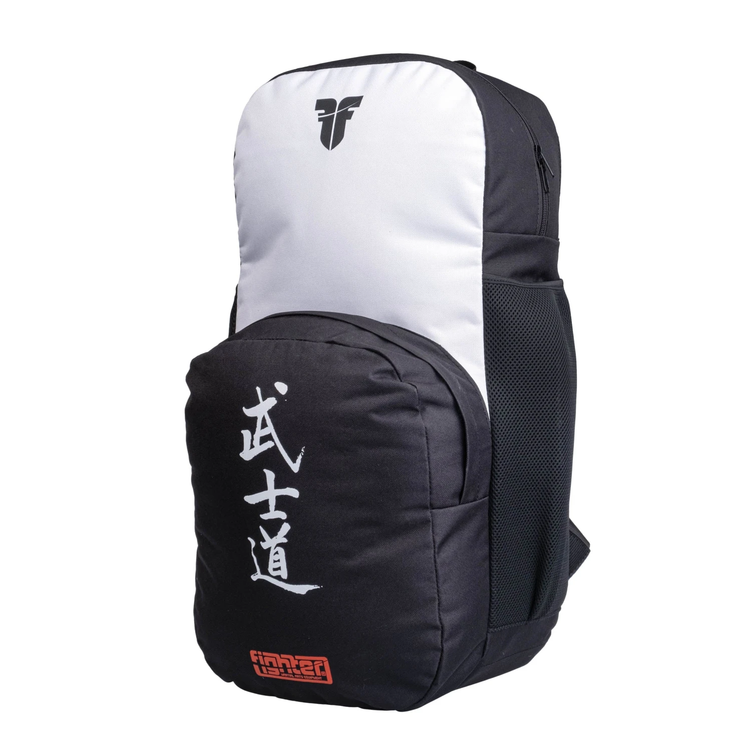 The Fighter backpack is made of a firm, anti-abrasion specially fabricated material. The backpack is composed of a main spacious pocket that is approximately 25 L large, and a  front pocket, which holds up to 5 l of material, and on the side of the backpack are two pockets designed specifically for bottles of beverages. These large side pockets take up to 1.5 L bottles.